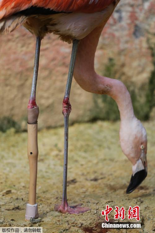 假肢由碳纤维制成,用硅胶封口,安在了这只火烈鸟的脚的中下位置。等到火烈鸟完全掌握如何使用假肢,动物园管理人员将把它和同伴关在一起生活。