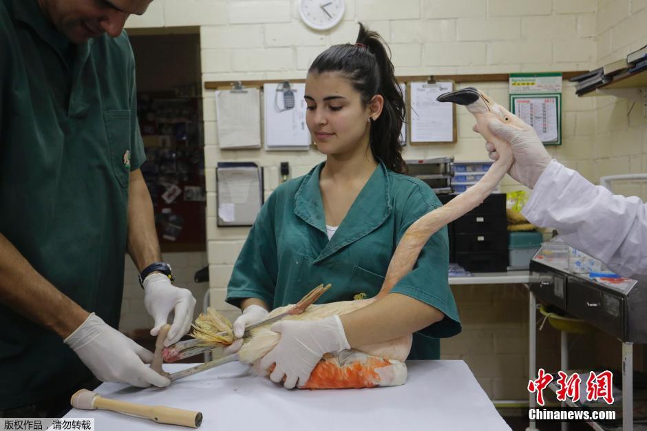 图为动物园的兽医正在给粉红火烈鸟装上假肢。兽医安德烈·科斯塔表示:“我们原本以为安了假肢会很不方便,但是植入假肢后,这只火烈鸟站了起来,保持平衡后就开始往前走,我们真的觉得不可思议。”