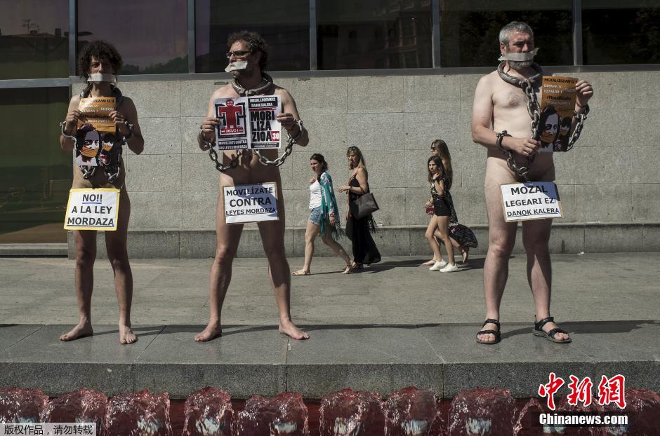 当地时间2015年6月25日,西班牙毕尔巴鄂,活动家裸体抗议“公共安全法”。该法律将于7月1日生效,其加重了对非法示威、扰乱公共事务及损坏警察形象的活动家的罚款。