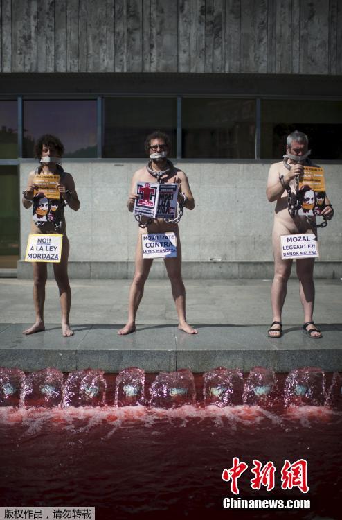 当地时间2015年6月25日,西班牙毕尔巴鄂,活动家裸体抗议“公共安全法”。该法律将于7月1日生效,其加重了对非法示威、扰乱公共事务及损坏警察形象的活动家的罚款。