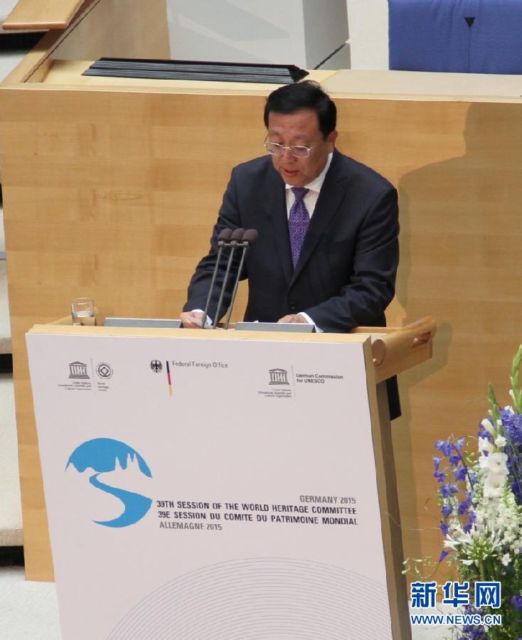 6月28日,在德国波恩,联合国教科文组织第37届大会主席、中国教育部副部长郝平在第39届世界遗产大会开幕式上讲话。第39届联合国教科文组织世界遗产委员会会议(世界遗产大会)28日晚在德国波恩开幕。大会将审议新一批世界自然与文化遗产项目,并对已列入名录的世界遗产的保护工作进行监督指导。新华社记者沈忠浩摄