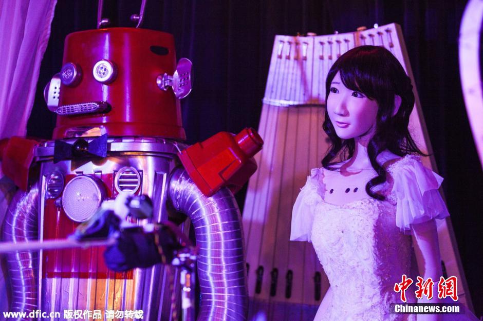 当地时间2015年6月27日,日本东京表参道,日本首个机器人婚礼在表参道的Cay咖啡馆举行,一对机器人在人类和众机器人的祝福下走向了婚姻殿堂。