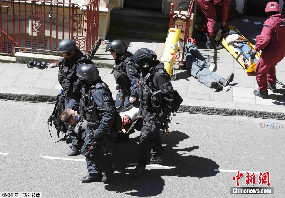 当地时间2015年6月30日,英国伦敦,伦敦应急部门在当地奥德乌奇地铁车站进行反恐演习。数百名警察参加了此次演习,以检测面对类似于突尼斯恐袭案的应对能力。