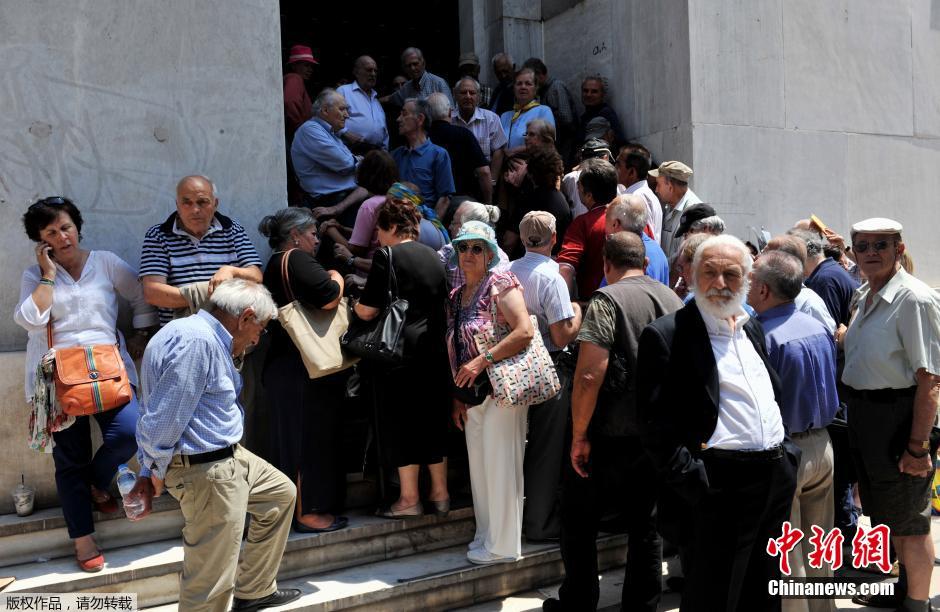 当地时间2015年6月29日,希腊塞萨洛尼基,老年人等待领取养老金,银行被关闭。希腊关闭银行并实行资本管制,全国超1/3提款机被取空。投资者匆忙消化“希腊脱欧”风险。