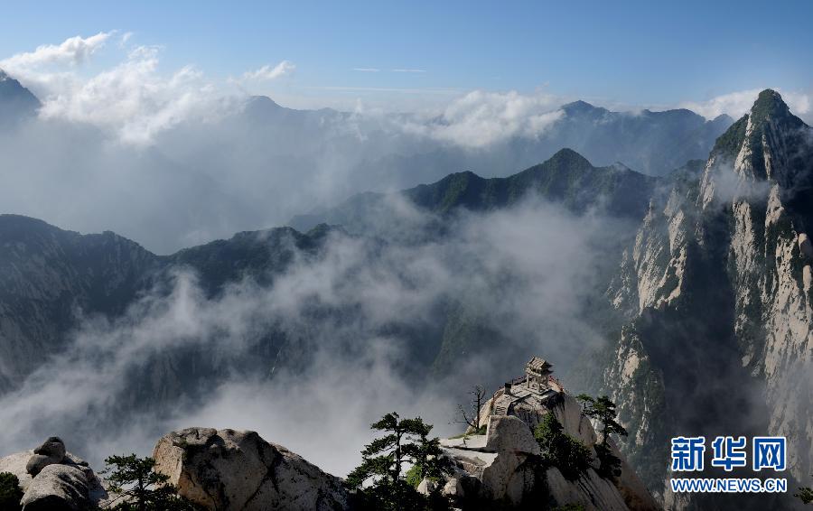 7月1日,华山东峰博台在云蒸雾绕中若隐若现。进入夏季,有“天下第一险”之称的西岳华山雨量增加,云量增多,雨后初晴时蒸腾的云雾缠绕着华山峭壁不断幻化游动,成为华山独特的夏景。新华社记者 陶明 摄