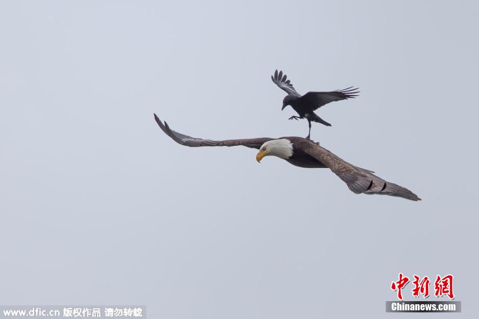 2015年7月1日报道,美国业余摄影师Phoo Chan拍下了一辑罕见有趣的画面。一只胆大的乌鸦停在正在觅食的秃 图片来源:东方ic 版权作品 请勿转载