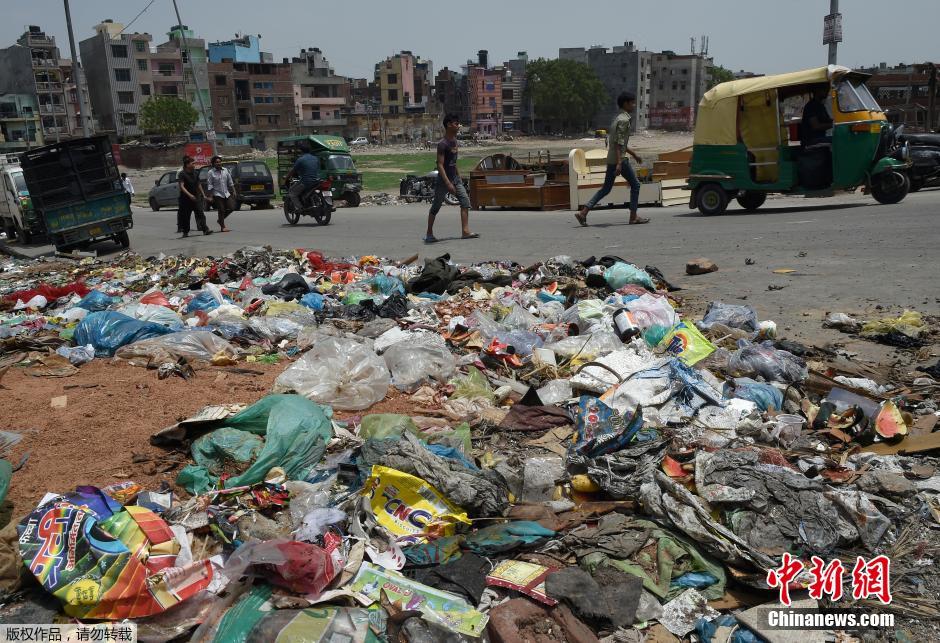 图为新德里的街道旁,散落着大量的生活垃圾。