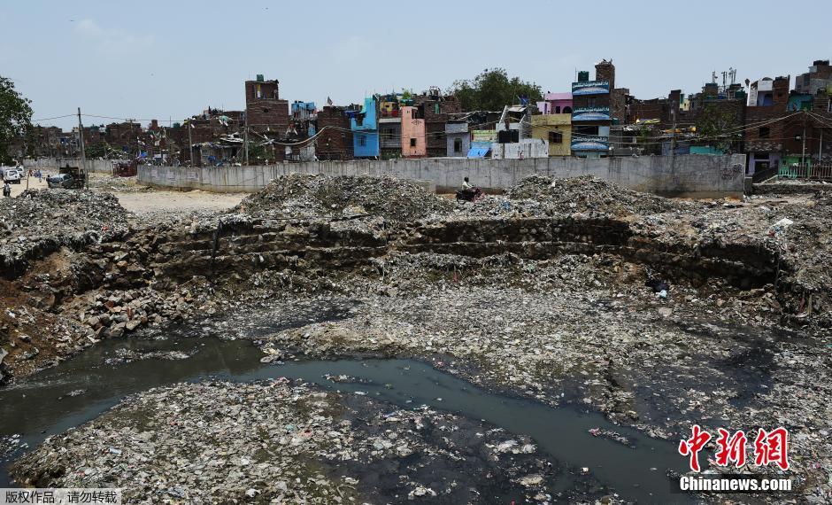 图为新德里的一处居民区紧邻着大面积的垃圾和污水沟。