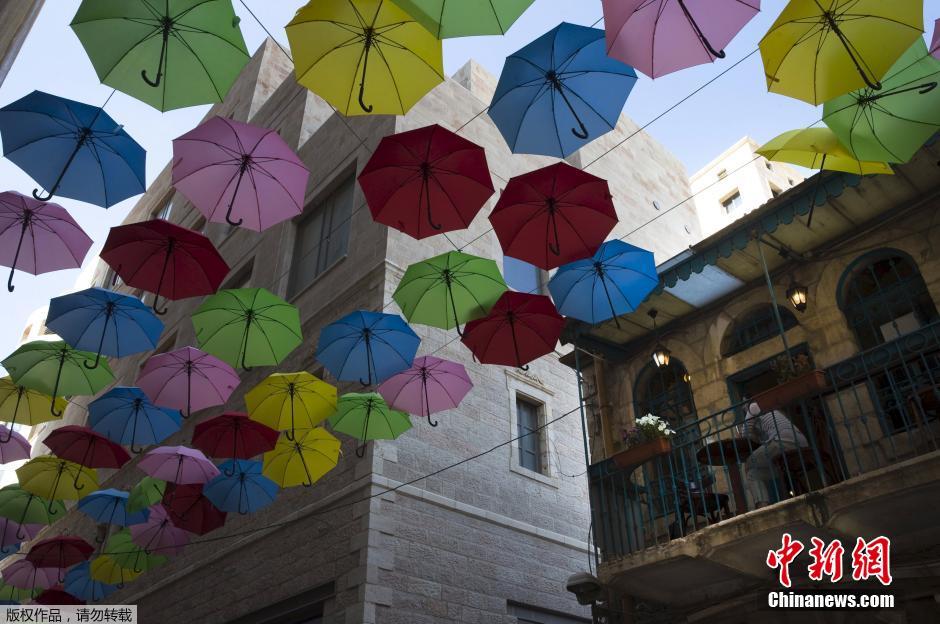 当地时间2015年6月30日,耶路撒冷,一条步行街大道上空布置约1000顶彩伞。市政当局试图举办更多的文化活动来吸引游客。