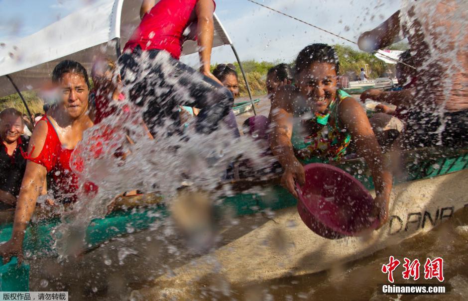 当地时间2015年6月29日,墨西哥纳亚里特州,天主教徒互相泼水庆祝圣佩德罗和圣巴勃罗节日。每年6月29日都有来自圣佩德罗和圣巴勃罗的队伍参加庆祝活动,他们认为当天Mexcaltitan岛附近的水受到祝福,可以给渔民带来一年好运。