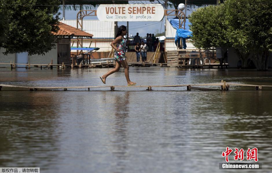 图为当地小孩在水面上搭起的木桥上跑过。