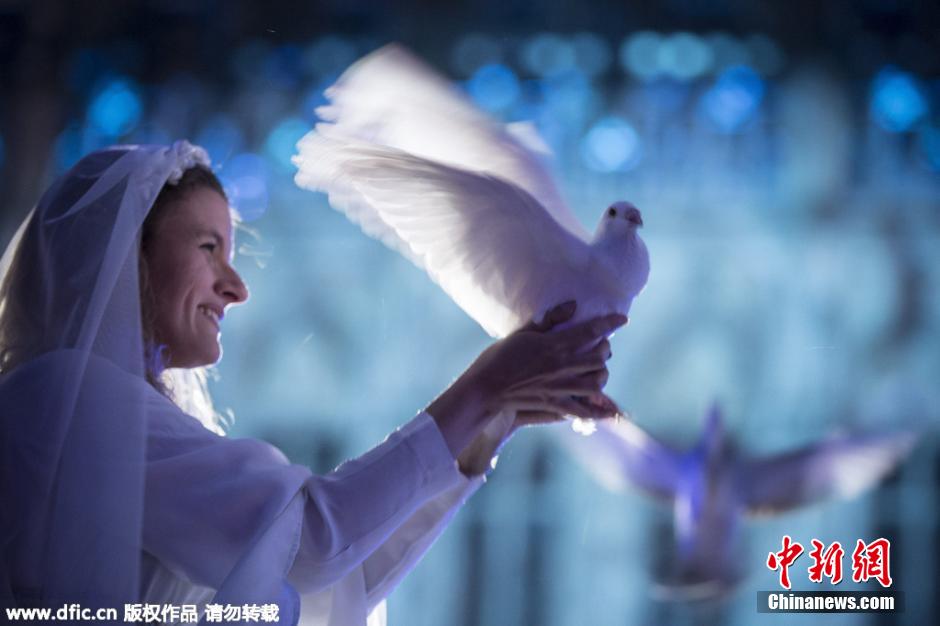 图为庆典上,一位中世纪打扮的妇女正在放飞一只鸽子。