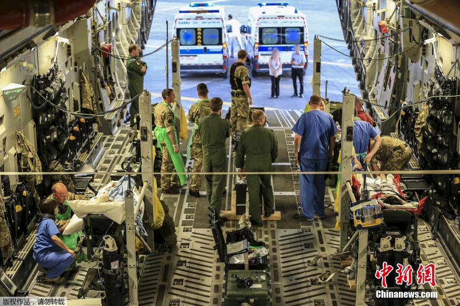图为突尼斯救护车将受重伤的英国游客送往英国空军的C17运输机上。