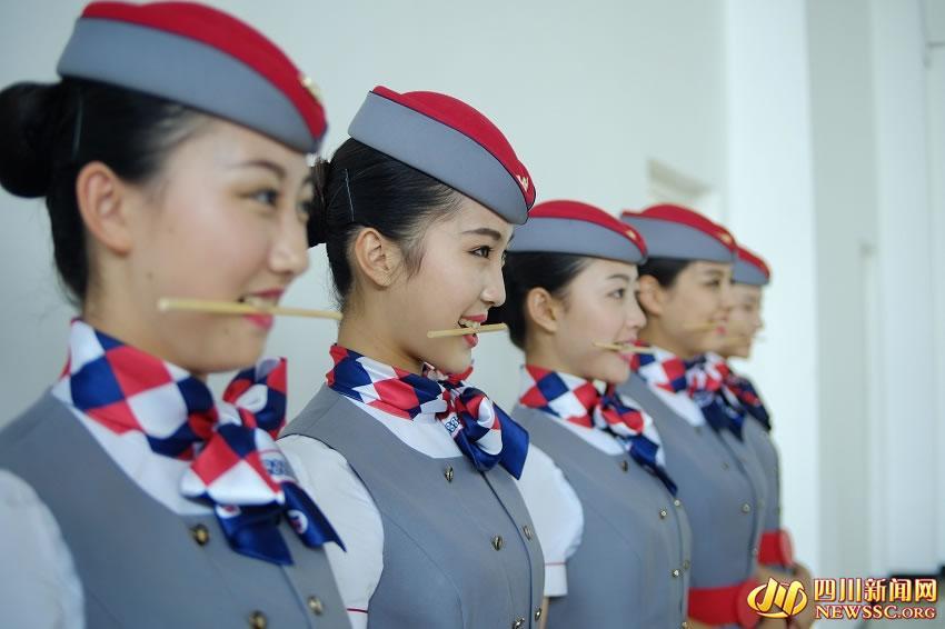 礼仪课上,准空姐们咬着筷子练习微笑。张进春 摄 图片来源:四川新闻网