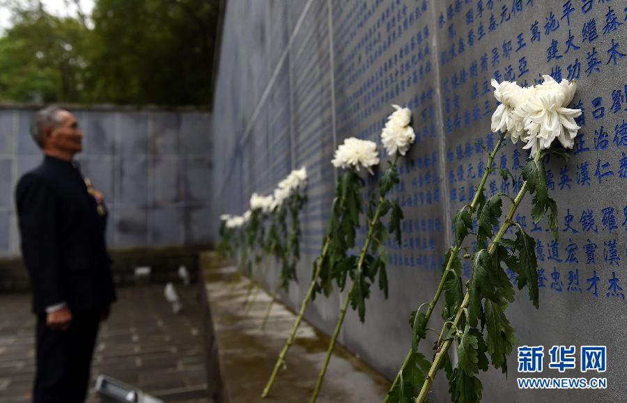 90岁的抗战老兵卢彩文在国殇墓园的中国远征军名录墙前哀悼战友(7月21日摄)。