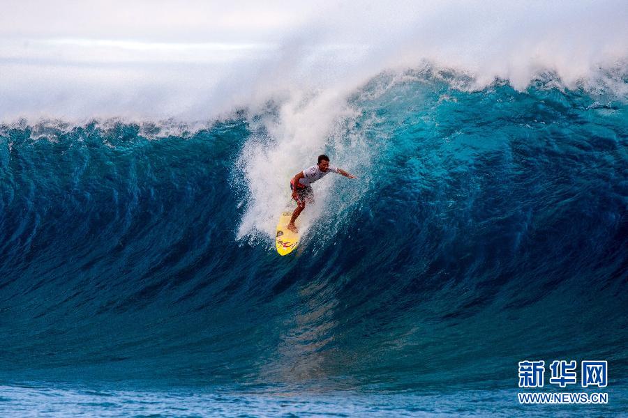 8月24日,在南太平洋塔西提岛,巴西选手桑托斯在世界冲浪巡回赛中与海浪“搏击”。 新华社/法新