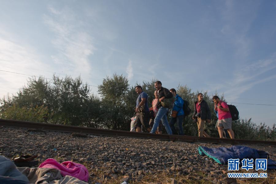 8月30日,在匈牙利南部边境地区的勒斯凯附近,难民沿连接匈牙利和塞尔维亚的一条铁路线进入匈牙利境内。匈牙利国防部29日宣布,匈牙利军方将在匈牙利和塞尔维亚边界建起围墙和铁丝网,以阻挡非法越境的难民。匈牙利作为欧盟和申根区的边境国家,是偷渡者踏入欧盟的主要门户之一。自今年以来,已有超过14万难民和非法移民通过塞尔维亚进入匈牙利,绝大多数人在匈牙利停留数日后前往奥地利等西欧国家。新华社发(弗尔季·奥蒂洛摄)