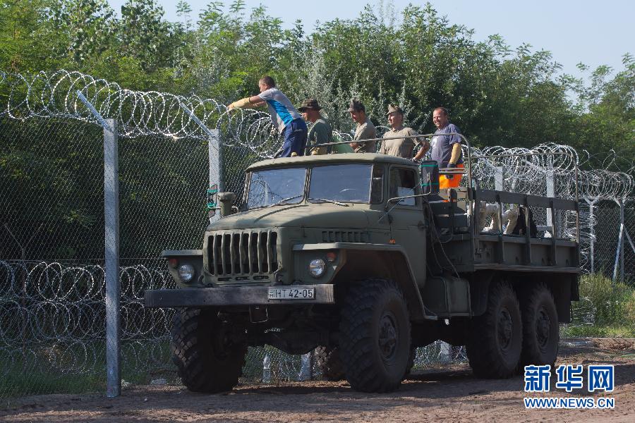 8月30日,在匈牙利南部边境地区的阿绍特豪洛姆附近,匈牙利军人和工人在4米高的围墙顶部安装铁丝网。匈牙利国防部29日宣布,匈牙利军方将在匈牙利和塞尔维亚边界建起围墙和铁丝网,以阻挡非法越境的难民。匈牙利作为欧盟和申根区的边境国家,是偷渡者踏入欧盟的主要门户之一。自今年以来,已有超过14万难民和非法移民通过塞尔维亚进入匈牙利,绝大多数人在匈牙利停留数日后前往奥地利等西欧国家。新华社发(弗尔季·奥蒂洛摄)
