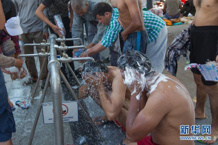 8月30日,在匈牙利首都布达佩斯,滞留在东火车站附近中转站的非法移民在洗漱。
