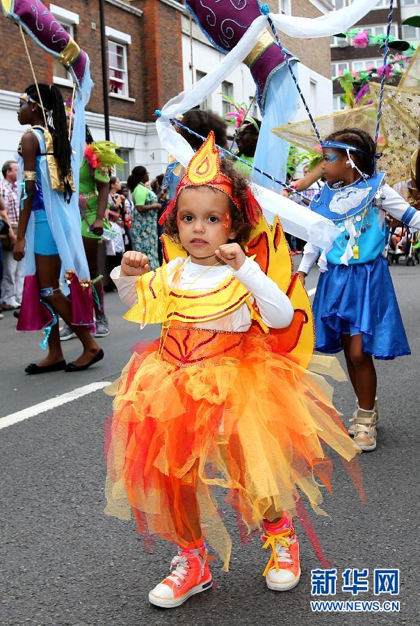 8月30日,一名表演者参加在英国伦敦西区举行的诺丁山狂欢节儿童日游行。
