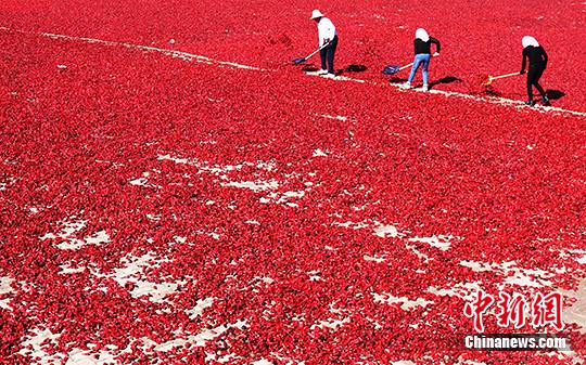 地处甘肃西部的玉门市花海镇辣椒农民合作社的工人在晾晒红辣椒。 裴海博 摄