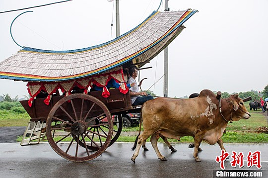 9月17日,在马来西亚马六甲的一个马来人聚居的地方,2015中国-东盟汽车拉力赛车队体验了一把当地的牛车。中新社发 翟李强 摄
