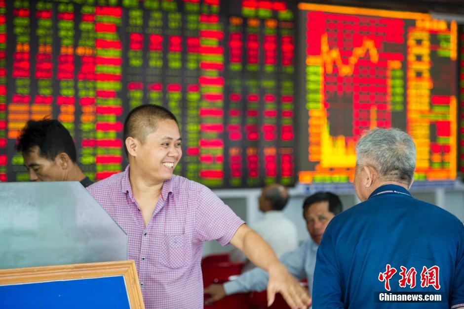 9月18日,海口某证券交易大厅的股民笑开颜。截至收盘两市合计成交4726亿元,上证综指报收3097.92点,涨11.86点,涨幅0.38%,成交2184亿元;深成指报收9850.77点,涨110.88点,涨幅1.14%,成交2542亿元。创业板指报收1983.30点,涨50.00点,涨幅2.59%,成交748.2亿元。中新社发 骆云飞 摄