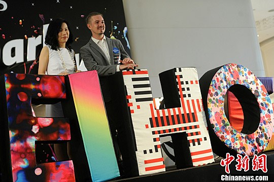 9月18日,英国字体创作艺术大师Sean Freeman(右)首度来香港,为“#MYSPARKHK”展览打造出色彩夺目26个英文字母。中新社发 谭达明 摄