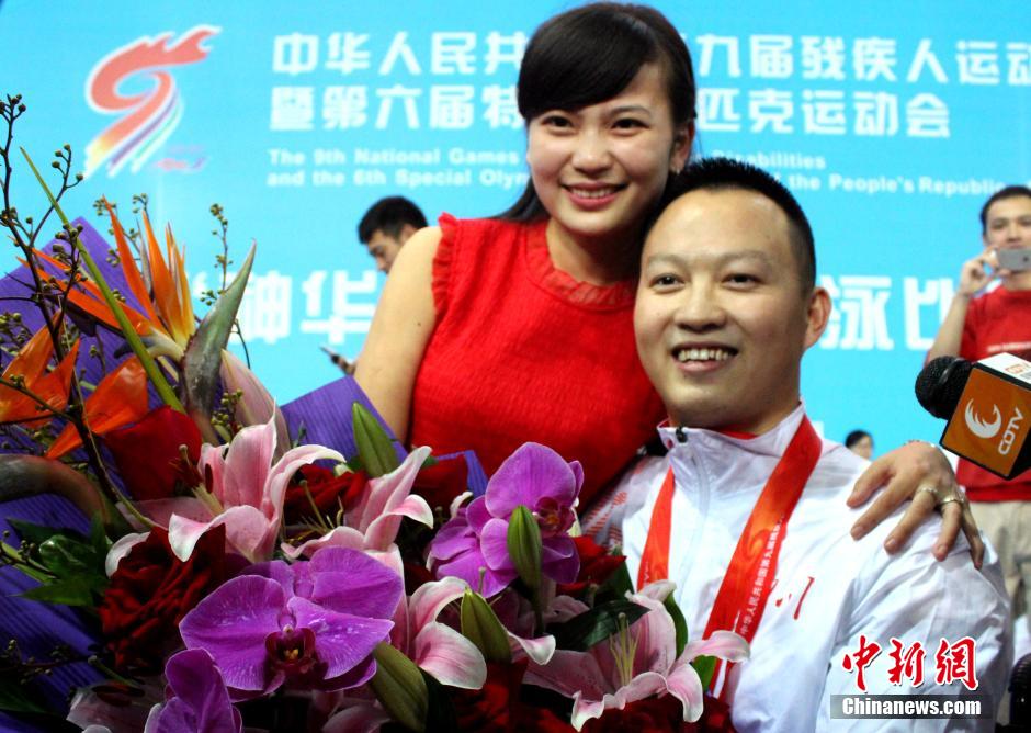 9月18日,求婚成功后的代国宏和女友。当日,中国第九届残运会暨第六届特奥会游泳赛场出现浪漫一幕,四川游泳队运动员“无腿蛙王”代国宏现场向女友苏思妙求婚成功。据悉,代国宏在汶川地震中失去双腿,后克服困难成为一名游泳运动员,2012年还参加了伦敦残奥会。中新社发 钟欣 摄