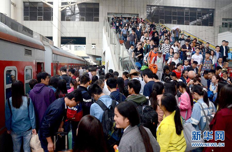 10月7日,旅客在郑州火车站乘车。郑州铁路局预计当日发送旅客45万人。 当日是“十一”小长假的最后一天,全国各地迎来返程客流高峰。新华社记者 李安 摄