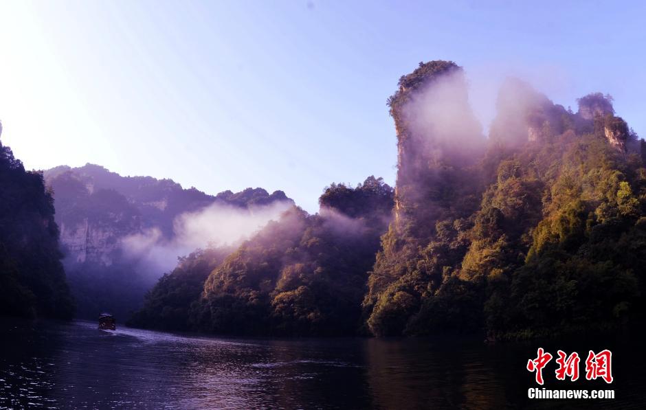 10月8日晨,雨过天晴的湖南张家界武陵源宝峰湖景区薄雾轻绕,船在湖中漫游,宛如一幅壮丽清新的山水画卷。