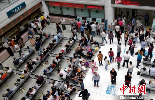 10月8日,福州市民在医院等候领取药品。当日是国庆长假后上班第一天,福州各大医院迎来就诊高峰。 张斌 摄