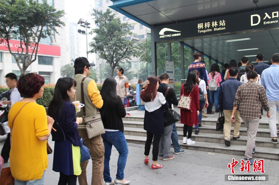 10月8日,国庆长假后首个上班日,成都上班族排队乘坐地铁,排队长龙一直延伸到地面百米远。