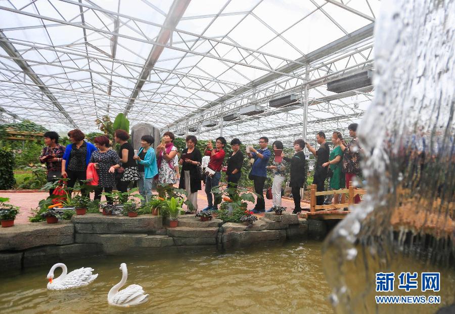 10月7日,游客在江苏省盱眙县澳吉尔国际绿博园参观。国庆长假,江苏淮安首家现代农业科普园澳吉尔国际绿博园成为当地居民放松身心的新去处。该园采用智能化温室,以盆式、墙式、床式、环形、管式、柱式等新型栽培技术,培育特色的瓜果、花卉及蔬菜。游人到此,可置身花果香气之中,即可观赏新型的农业科技,还可以采摘品尝新鲜的农产品。新华社发(周海军 摄)