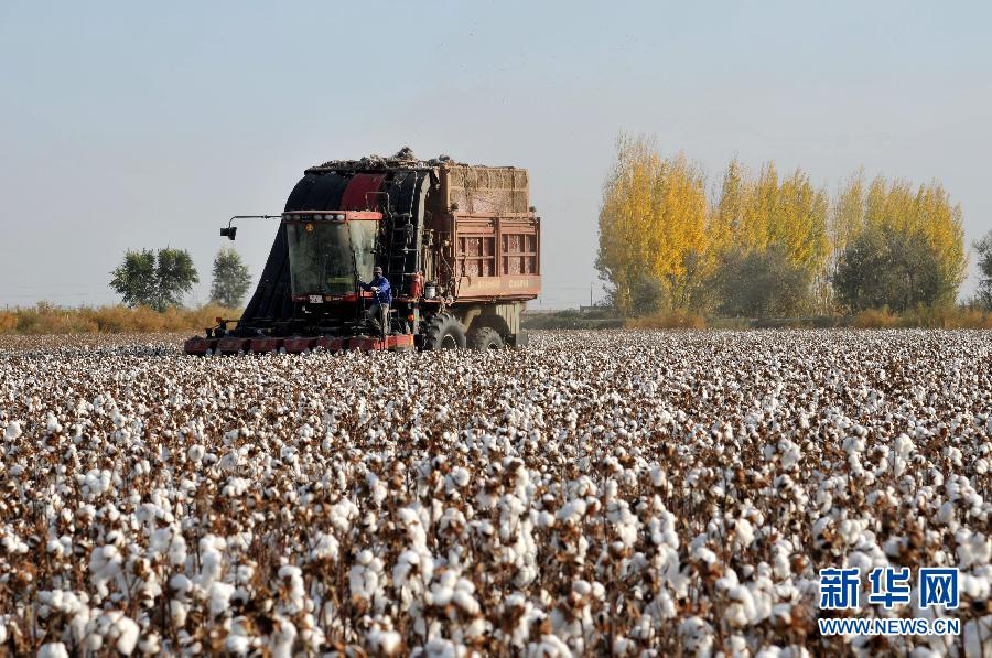 10月9日,兵团第六师105团采棉机在采摘新棉。日前,新疆生产建设兵团900多万亩棉花进入采收旺季。据了解,今年兵团棉花预计总产皮棉148万余吨,产量占据全国四分之一。新华社发(陈鹏 摄)