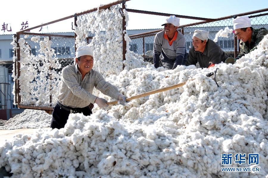 10月9日,兵团第六师105团轧花场职工在交售新棉。日前,新疆生产建设兵团900多万亩棉花进入采收旺季。据了解,今年兵团棉花预计总产皮棉148万余吨,产量占据全国四分之一。新华社发(陈鹏 摄)