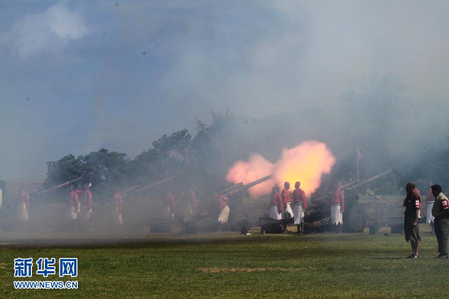 10月9日,在斐济首都苏瓦,仪仗队在国庆阅兵仪式上鸣放礼炮。