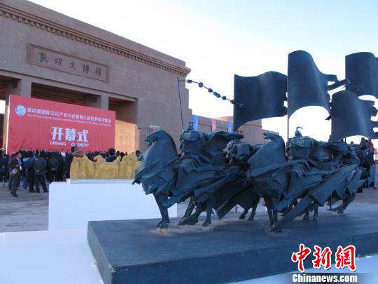 10月14日,第四届国际文化产业大会暨第八届甘肃省文博会在敦煌举行开幕式,现场布置了数十件具有敦煌元素的雕塑作品。 殷春永 摄