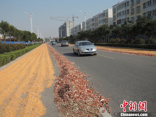 原阳县城博学路上,宽阔的四车道被晾晒的玉米“挤”成两车道,来往车辆只能压黄线走在道路中间。 韩章云 摄