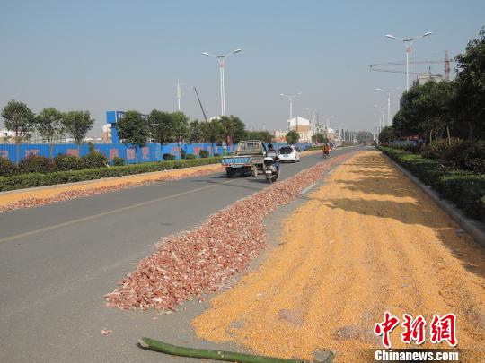 在玉米铺就的“黄金大道”上,非机动车与机动车都走在道路中间,行车安全令人堪忧。 韩章云 摄