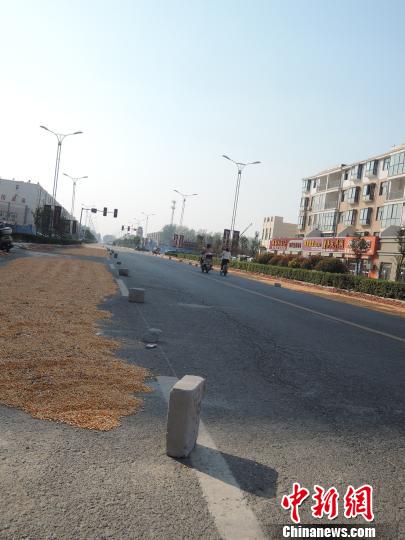 村民为了保护晾晒在马路上的玉米不被来往车辆、行人踩踏,用石块、树枝甚至玉米棒摆在马路中间当做隔离带。 韩章云 摄