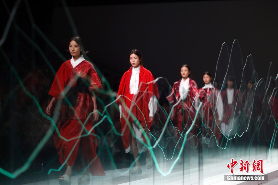 10月13日晚,上海新天地太平湖公园,ZHUCHONGYUN“境·像”2016春夏时装发布会的举行,为上海时装周拉开序幕。现场空间设计以“筑浪天地外,山色有无中”的视觉诗意,营造闲远淡泊的意境。 中新社记者 盛佳鹏 摄