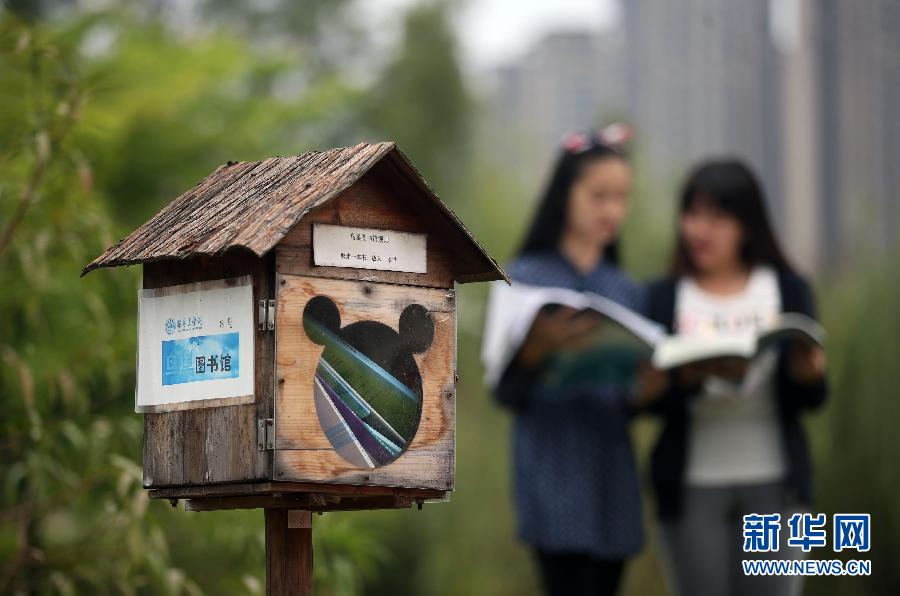 10月13日,桂林医学院的两名大学生在“鸟巢图书馆”旁看书。新华社发(刘教清 摄)