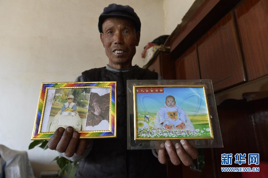 在宁夏泾源县六盘山镇大庄村,今年62岁的金玉华老人在家中展示他的孙子的照片,他的女儿出嫁到了河南,老伴目前也帮女儿带孙子去了,家中就剩下他一个人(10月15日摄)。新华社记者 彭昭之 摄