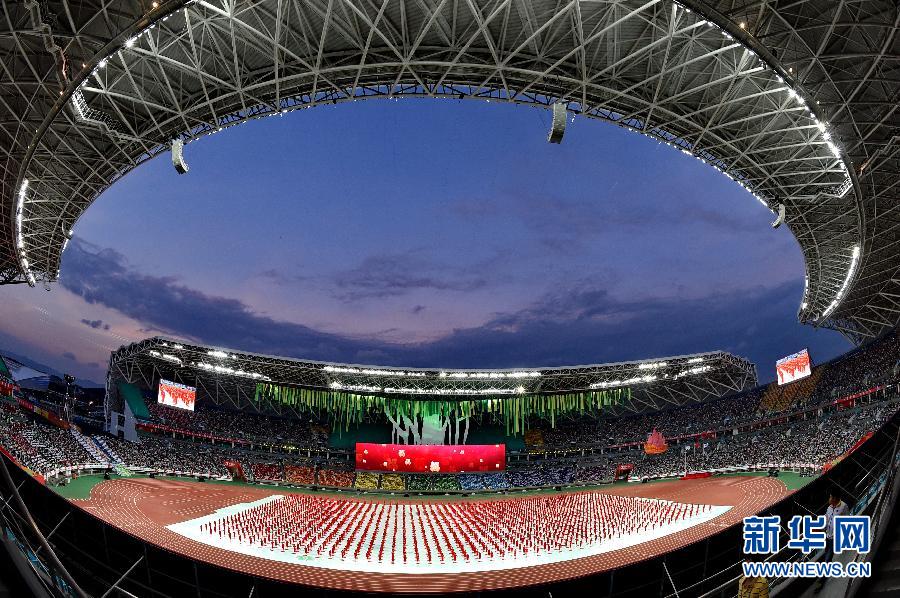 10月18日,演员在开幕式上进行文艺表演。 当日,第一届全国青年运动会开幕式在福州海峡奥体中心主体育场举行。 新华社记者张国俊摄