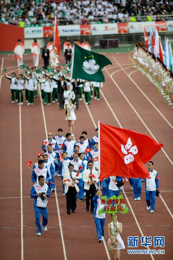 10月18日,香港特别行政区体育代表团(前)入场。 当日,第一届全国青年运动会开幕式在福州海峡奥体中心主体育场举行。新华社记者张金加摄