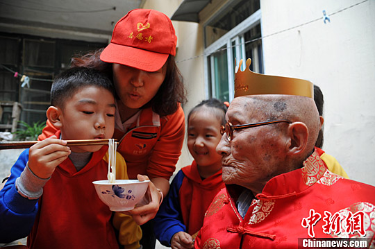 当日,合肥市蜀山区翠竹园社区的志愿者带领辖区幼儿园小朋友,来到百岁老人夏永仓的家中,陪老人一起切蛋糕,吃寿面,共度即将到来的重阳节。