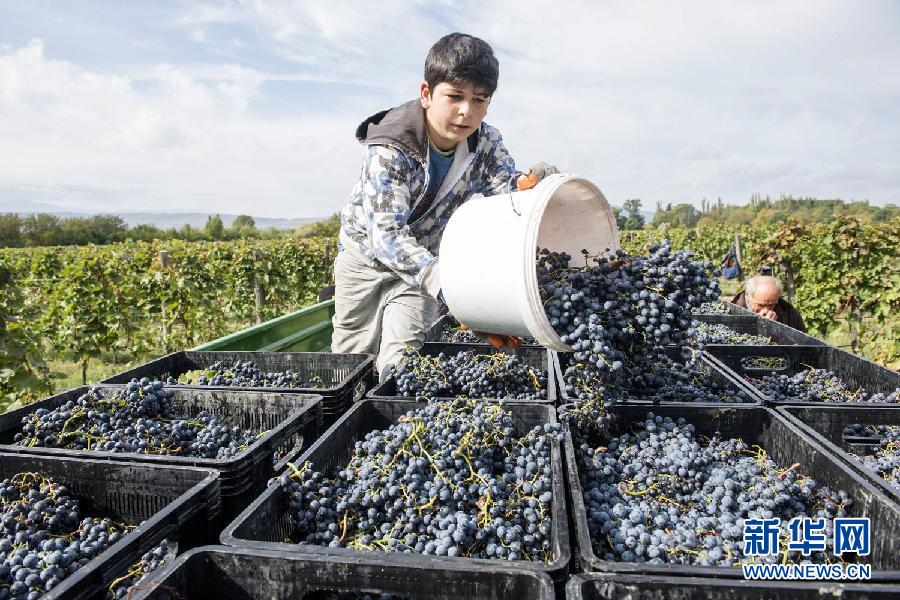 10月18日,在格鲁吉亚的一个酒庄,一名男子搬运成熟的葡萄。格鲁吉亚是世界著名的葡萄及葡萄酒产地,被称为世界葡萄酒发源地之一。每年10月份是格鲁吉亚葡萄大面积成熟的季节,民众会在此期间举行一系列活动,欢庆葡萄丰收。新华社发(格奥尔基·伊杜阿什维利摄)