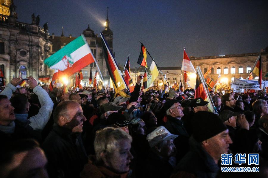 10月19日,在德国东部城市德累斯顿,示威者手举旗帜参加游行。德国东部城市德累斯顿19日晚发生大规模排外示威,反对大量难民涌入。当晚参加排外示威和反排外游行团体人员总数或超过3万人。排外者认为,难民到来会扰乱就业市场,还会带来文化上巨大冲击。反排外者则试图传递另一种声音,守卫德国“欢迎文化”。新华社记者张帆摄