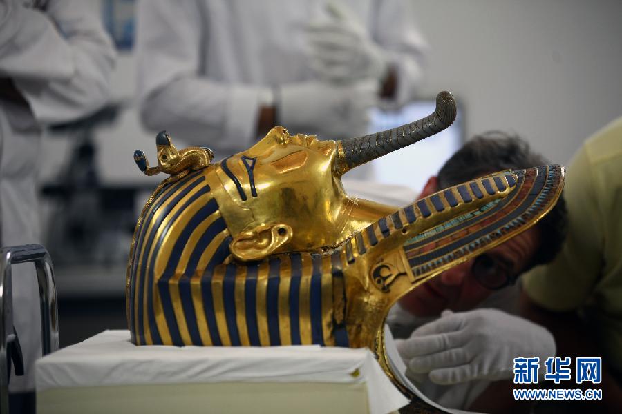 这是10月20日在位于埃及开罗的埃及国家博物馆拍摄的正在修复中的图坦卡蒙法老黄金面具。新华社发(艾哈迈德·戈马摄)